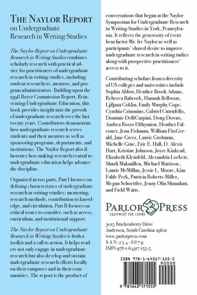 The Naylor Report on Undergraduate Research in Writing Studies combines scholarly research with practical advice for practitioners of undergraduate research in writing studies, including student researchers, mentors, and program administrators. Building upon the 1998 Boyer Commission Report, Reinventing Undergraduate Education, this book provides insight into the growth of undergraduate research over the last twenty years. Contributors demonstrate how undergraduate research serves students and their mentors as well as sponsoring programs, departments, and institutions. The Naylor Report also illustrates how making research central to undergraduate education helps advance the discipline. Organized in two parts, Part I focuses on defining characteristics of undergraduate research in writing studies: mentoring, research methods, contribution to knowledge, and circulation. Part II focuses on critical issues to consider, such as access, curriculum, and institutional support. The Naylor Report on Undergraduate Research in Writing Studies is both a toolkit and a call to action. It helps readers not only engage in undergraduate research but also develop and sustain undergraduate research efforts locally on their campuses and in their communities. The report is the product of conversations that began at the Naylor Symposium for Undergraduate Research in Writing Studies in York, Pennsylvania. It reflects the generosity of event benefactor Mr. Irv Naylor as well as participants' shared desire to improve undergraduate research in writing studies along with prospective practitioners' access to it. Contributing scholars from a diversity of US colleges and universities include Sophia Abbot, Heather Brook Adams, Rebecca Babcock, Hannah Bellwoar, Ljiljana Coklin, Emily Murphy Cope, Cynthia Crimmins, Gabriel Cutrufello, Dominic DelliCarpini, Doug Downs, Andrea Rosso Efthymiou, Heather Falconer, Jenn Fishman, William FitzGerald, Jane Greer, Laurie Grobman, Michelle Grue, Eric E. Hall, D. Alexis Hart, Kristine Johnson, Joyce Kinkead, Elizabeth Kleinfeld, Alexandria Lockett, Shurli Makmillen, Michael Mattison, Laurie McMillan, Jessie L. Moore, Kim Fahle Peck, Patricia Roberts-Miller, Megan Schoettler, Jenny Olin Shanahan, and Field Watts.