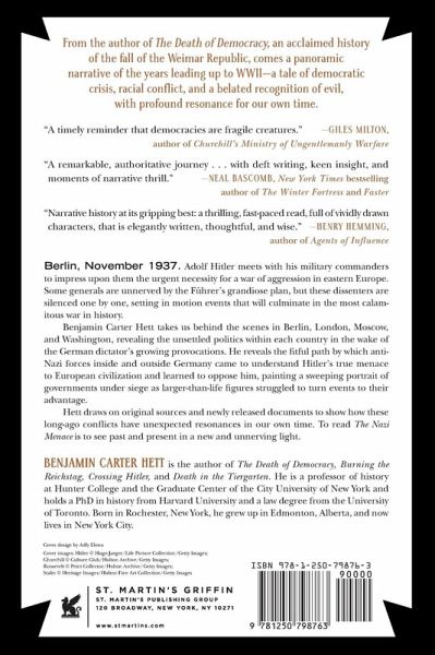 A panoramic narrative of the years leading up to the Second World War-a tale of democratic crisis, racial conflict, and a belated recognition of evil, with profound resonance for our own time. Berlin, November 1937. Adolf Hitler meets with his military commanders to impress upon them the urgent necessity for a war of aggression in eastern Europe. Some generals are unnerved by the Führer's grandiose plan, but these dissenters are silenced one by one, setting in motion events that will culminate in the most calamitous war in history. Benjamin Carter Hett takes us behind the scenes in Berlin, London, Moscow, and Washington, revealing the unsettled politics within each country in the wake of the German dictator's growing provocations. He reveals the fitful path by which anti-Nazi forces inside and outside Germany came to understand Hitler's true menace to European civilization and learned to oppose him, painting a sweeping portrait of governments under siege, as larger-than-life figures struggled to turn events to their advantage. As in The Death of Democracy, his acclaimed history of the fall of the Weimar Republic, Hett draws on original sources and newly released documents to show how these long-ago conflicts have unexpected resonances in our own time. To read The Nazi Menace is to see past and present in a new and unnerving light.
