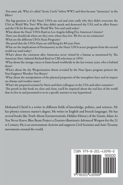 -You must ask: Why it's called "Arctic Circle" before WW2 and then became "Antarctica" in the fifties ? -The big question is if the Nazis' UFOs are real and exist really why they didn't overcome the USA in World War Two? Why they didn't attack and destroyed the USA and its allies France and the UK for Revenge after World War Two and until today? -What about the Nazis' UFOs Raid on Los Angeles killing Five American Citizens? -Then you should ask where are they now, where they live. We live on six continents! -What are the different UFOs Nazis Programs? -The proof that the UFOs Nazis are still flying for 80 years Now. -What are the implications of Freemasonry in the Nazis' UFOs secret programs from the second world war until today? -What's about the continent after Antarctica never visited by a human as mentioned by The American Navy Admiral Richard Byrd on CBS television in 1955? -What about the strange voices or hums heard worldwide in the last twenty years, who is behind them? -What's about the sky Weaponization threat revealed by the Nasa Space program pioneer the Nazi Engineer Wernher Von Braun? -What about the manipulation of the physical properties of the ionosphere layer and its impact on climate and weather states? -What's the prepared scenario by Nazis and their colleagues in the USA and other countries? -The proofs in this book are clear and clean, you'll be surprised about the real face of the world that we live in and presented to us in a specific manner to stay hypnotized.