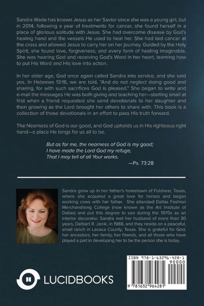 Sandra Wade has known Jesus as her Savior since she was a young girl, but in 2014, following a year of treatments for cancer, she found herself in a place of glorious solitude with Jesus. She had overcome disease by God's healing hand and the vessels He used to heal her. She had laid cancer at the cross and allowed Jesus to carry her on her journey. Guided by the Holy Spirit, she found love, forgiveness, and every form of healing imaginable. She was hearing God and receiving God's Word in her heart, learning how to put His Word and His love into action. In her older age, God once again called her into service, and she said yes. In Hebrews 13:16, we are told, "And do not neglect doing good and sharing, for with such sacrifices God is pleased." She began to write and e-mail the messages He was both giving and teaching her-starting small at first when a friend requested she send devotionals to her daughter and then growing as the Lord brought her others to share with. This book is a collection of those devotionals in an effort to pass His truth forward. The Nearness of God is our good, and God upholds us in His righteous right hand-a place He longs for us all to be. But as for me, the nearness of God is my good; I have made the Lord GOD my refuge, That I may tell of all Your works. -Ps. 73:28¿