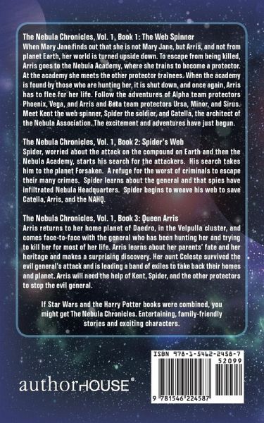 The Nebula Chronicles, Vol. 1, Book 1: The Web Spinner When Mary Jane finds out that she is not Mary Jane, but Arris, and not from planet Earth, her world is turned upside down. To escape from being killed, Arris goes to the Nebula Academy, where she trains to become a protector. At the academy she meets the other protector trainees. When the academy is found by those who are hunting her, it is shut down, and once again, Arris has to flee for her life. Follow the adventures of Alpha team protectors Phoenix, Vega, and Arris and Beta team protectors Ursa, Minor, and Sirus. Meet Kent the web spinner, Spider the soldier, and Catella, the architect of the Nebula Association. The excitement and adventures have just begun. The Nebula Chronicles, Vol. 1, Book 2: Spiders Web Spider, worried about the attack on the compound on Earth and then the Nebula Academy, starts his search for the attackers. His search takes him to the planet Forsaken. A refuge for the worst of criminals to escape their many crimes. Spider learns about the general and that spies have infiltrated Nebula Headquarters. Spider begins to weave his web to save Catella, Arris, and the NAHQ. The Nebula Chronicles, Vol. 1, Book 3: Queen Arris Arris returns to her home planet of Daedro, in the Velpulla cluster, and comes face-to-face with the general who has been hunting her and trying to kill her for most of her life. Arris learns about her parents fate and her heritage and makes a surprising discovery. Her aunt Celeste survived the evil generals attack and is leading a band of exiles to take back their homes and planet. Arris will need the help of Kent, Spider, and the other protectors to stop the evil general. If Star Wars and the Harry Potter books were combined, you might get The Nebula Chronicles. Entertaining, family-friendly stories and exciting characters.