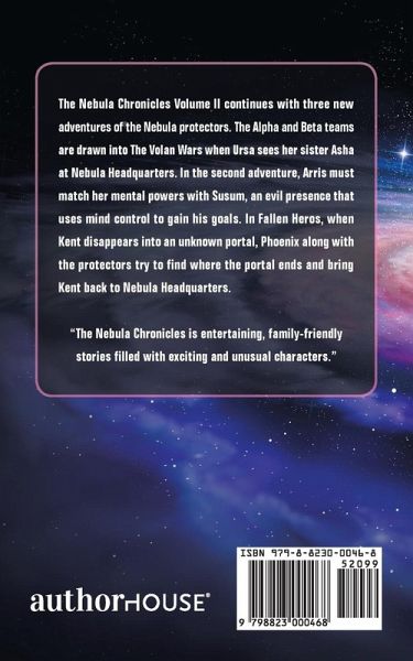 The Nebula Chronicles Volume II continues with three new adventures of the Nebula protectors. The Alpha and Beta teams are drawn into The Volan Wars when Ursa sees her sister Asha at Nebula Headquarters. In the second adventure, Arris must match her mental powers with Susum, an evil presence that uses mind control to gain his goals. In Fallen Heros, when Kent disappears into an unknown portal, Phoenix along with the protectors try to find where the portal ends and bring Kent back to Nebula Headquarters.