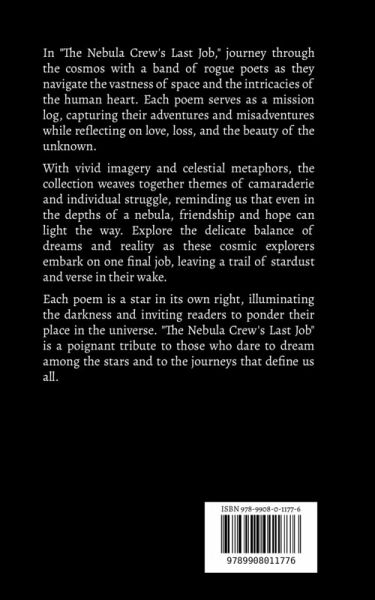 In "The Nebula Crew's Last Job," journey through the cosmos with a band of rogue poets as they navigate the vastness of space and the intricacies of the human heart. Each poem serves as a mission log, capturing their adventures and misadventures while reflecting on love, loss, and the beauty of the unknown. With vivid imagery and celestial metaphors, the collection weaves together themes of camaraderie and individual struggle, reminding us that even in the depths of a nebula, friendship and hope can light the way. Explore the delicate balance of dreams and reality as these cosmic explorers embark on one final job, leaving a trail of stardust and verse in their wake. Each poem is a star in its own right, illuminating the darkness and inviting readers to ponder their place in the universe. "The Nebula Crew's Last Job" is a poignant tribute to those who dare to dream among the stars and to the journeys that define us all.
