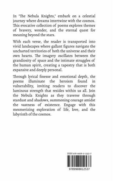 In "The Nebula Knights," embark on a celestial journey where dreams intertwine with the cosmos. This evocative collection of poems explores themes of bravery, wonder, and the eternal quest for meaning beyond the stars. With each verse, the reader is transported into vivid landscapes where gallant figures navigate the uncharted territories of both the universe and their own hearts. The imagery oscillates between the grandiosity of space and the intimate struggles of the human spirit, creating a tapestry that is both expansive and deeply personal. Through lyrical finesse and emotional depth, the poems illuminate the heroism found in vulnerability, inviting readers to discover the luminous strength that resides within us all. Join the Nebula Knights as they traverse through stardust and shadows, summoning courage amidst the vastness of existence. Engage with this mesmerizing exploration of life, love, and the labyrinth of the cosmos.