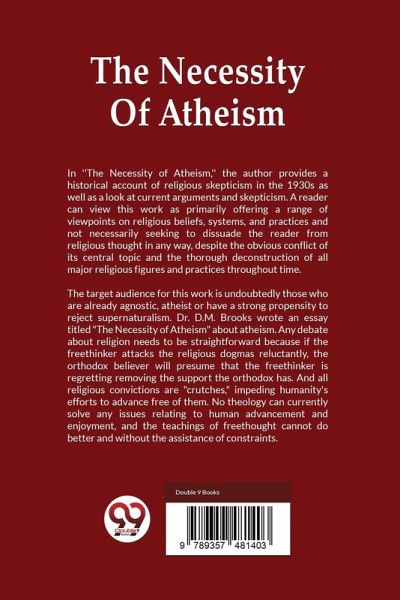 In ''The Necessity of Atheism,'' the author provides a historical account of religious skepticism in the 1930s as well as a look at current arguments and skepticism. A reader can view this work as primarily offering a range of viewpoints on religious beliefs, systems, and practices and not necessarily seeking to dissuade the reader from religious thought in any way, despite the obvious conflict of its central topic and the thorough deconstruction of all major religious figures and practices throughout time. The target audience for this work is undoubtedly those who are already agnostic, atheist or have a strong propensity to reject supernaturalism. Dr. D.M. Brooks wrote an essay titled "The Necessity of Atheism" about atheism. Any debate about religion needs to be straightforward because if the freethinker attacks the religious dogmas reluctantly, the orthodox believer will presume that the freethinker is regretting removing the support the orthodox has. And all religious convictions are "crutches," impeding humanity's efforts to advance free of them. No theology can currently solve any issues relating to human advancement and enjoyment, and the teachings of freethought cannot do better and without the assistance of constraints.