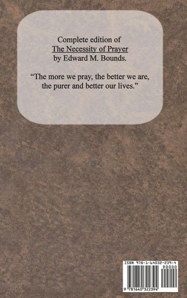 Complete edition of The Necessity of Prayer by Edward M. Bounds. This is a short and impactful classic on prayer, published for the layman. In it, Bounds answers deeply, "Why pray?" Read with an open heart, this book is helpful to read again and again at various stages of life. "The more we pray, the better we are, the purer and better our lives." No student of thought should be without this historic book. This edition is provided in a slim volume with full text at an affordable price. TABLE OF CONTENTS FOREWORD 3 1. PRAYER AND FAITH 3 2. PRAYER AND FAITH (CONTINUED) 6 3. PRAYER AND TRUST 10 4. PRAYER AND DESIRE 13 5. PRAYER AND FERVENCY 16 6. PRAYER AND IMPORTUNITY 18 7. PRAYER AND IMPORTUNITY (CONTINUED) 21 8. PRAYER AND CHARACTER AND CONDUCT 23 9. PRAYER AND OBEDIENCE 26 10. PRAYER AND OBEDIENCE (CONTINUED) 30 11. PRAYER AND VIGILANCE 31 12. PRAYER AND THE WORD OF GOD 34 13. PRAYER AND THE WORD OF GOD (CONTINUED) 37 14. PRAYER AND THE HOUSE OF GOD 40