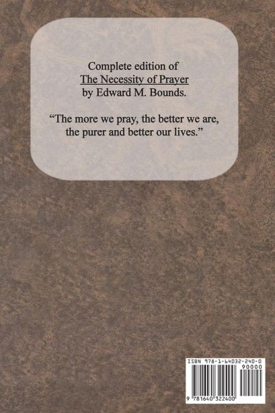 Complete edition of The Necessity of Prayer by Edward M. Bounds. This is a short and impactful classic on prayer, published for the layman. In it, Bounds answers deeply, "Why pray?" Read with an open heart, this book is helpful to read again and again at various stages of life. "The more we pray, the better we are, the purer and better our lives." No student of thought should be without this historic book. This edition is provided in a slim volume with full text at an affordable price. TABLE OF CONTENTS FOREWORD 3 1. PRAYER AND FAITH 3 2. PRAYER AND FAITH (CONTINUED) 6 3. PRAYER AND TRUST 10 4. PRAYER AND DESIRE 13 5. PRAYER AND FERVENCY 16 6. PRAYER AND IMPORTUNITY 18 7. PRAYER AND IMPORTUNITY (CONTINUED) 21 8. PRAYER AND CHARACTER AND CONDUCT 23 9. PRAYER AND OBEDIENCE 26 10. PRAYER AND OBEDIENCE (CONTINUED) 30 11. PRAYER AND VIGILANCE 31 12. PRAYER AND THE WORD OF GOD 34 13. PRAYER AND THE WORD OF GOD (CONTINUED) 37 14. PRAYER AND THE HOUSE OF GOD 40