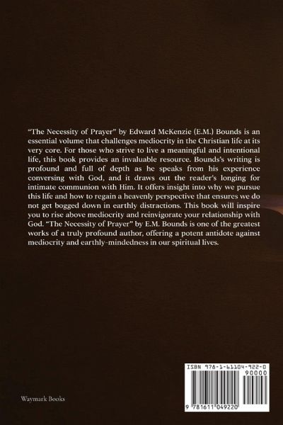 "The Necessity of Prayer" by Edward McKenzie (E.M.) Bounds is an essential volume that challenges mediocrity in the Christian life at its very core. For those who strive to live a meaningful and intentional life, this book provides an invaluable resource. Bounds's writing is profound and full of depth as he speaks from his experience conversing with God, and it draws out the reader's longing for intimate communion with Him. It offers insight into why we pursue this life and how to regain a heavenly perspective that ensures we do not get bogged down in earthly distractions. This book will inspire you to rise above mediocrity and reinvigorate your relationship with God. "The Necessity of Prayer" by E.M. Bounds is one of the greatest works of a truly profound author, offering a potent antidote against mediocrity and earthly-mindedness in our spiritual lives.