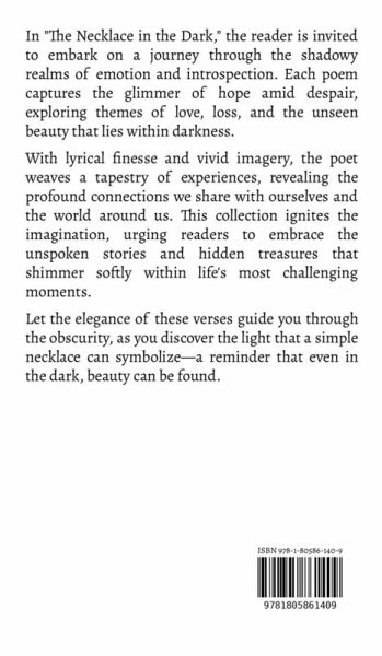 In "The Necklace in the Dark," the reader is invited to embark on a journey through the shadowy realms of emotion and introspection. Each poem captures the glimmer of hope amid despair, exploring themes of love, loss, and the unseen beauty that lies within darkness. With lyrical finesse and vivid imagery, the poet weaves a tapestry of experiences, revealing the profound connections we share with ourselves and the world around us. This collection ignites the imagination, urging readers to embrace the unspoken stories and hidden treasures that shimmer softly within life's most challenging moments. Let the elegance of these verses guide you through the obscurity, as you discover the light that a simple necklace can symbolize-a reminder that even in the dark, beauty can be found.