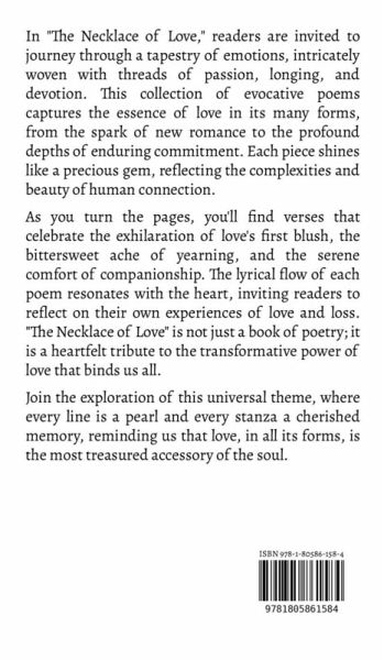 In "The Necklace of Love," readers are invited to journey through a tapestry of emotions, intricately woven with threads of passion, longing, and devotion. This collection of evocative poems captures the essence of love in its many forms, from the spark of new romance to the profound depths of enduring commitment. Each piece shines like a precious gem, reflecting the complexities and beauty of human connection. As you turn the pages, you'll find verses that celebrate the exhilaration of love's first blush, the bittersweet ache of yearning, and the serene comfort of companionship. The lyrical flow of each poem resonates with the heart, inviting readers to reflect on their own experiences of love and loss. "The Necklace of Love" is not just a book of poetry; it is a heartfelt tribute to the transformative power of love that binds us all. Join the exploration of this universal theme, where every line is a pearl and every stanza a cherished memory, reminding us that love, in all its forms, is the most treasured accessory of the soul.