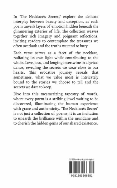 In "The Necklace's Secret," explore the delicate interplay between beauty and deception, as each poem unveils layers of emotion hidden beneath the glimmering exterior of life. The collection weaves together rich imagery and poignant reflections, inviting readers to contemplate the treasures we often overlook and the truths we tend to bury. Each verse serves as a facet of the necklace, radiating its own light while contributing to the whole. Love, loss, and longing intertwine in a lyrical dance, revealing the secrets we wear close to our hearts. This evocative journey reveals that sometimes, what we value most is intricately bound to the stories we choose to tell and the secrets we dare to keep. Dive into this mesmerizing tapestry of words, where every poem is a striking jewel waiting to be discovered, illuminating the human experience with grace and authenticity. "The Necklace's Secret" is not just a collection of poems; it is an invitation to unearth the brilliance within the mundane and to cherish the hidden gems of our shared existence.