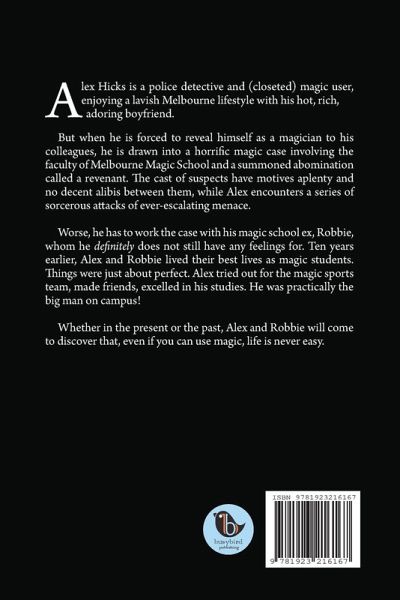 Alex Hicks is a police detective and (closeted) magic user, enjoying a lavish Melbourne lifestyle with his hot, rich, adoring boyfriend. But when he is forced to reveal himself as a magician to his colleagues, he is drawn into a horrific magic case involving the faculty of Melbourne Magic School and a summoned abomination called a revenant. The cast of suspects have motives aplenty and no decent alibis between them, while Alex encounters a series of sorcerous attacks of ever-escalating menace. Worse, he has to work the case with his magic school ex, Robbie, whom he definitely does not still have any feelings for. Ten years earlier, Alex and Robbie lived their best lives as magic students. Things were just about perfect. Alex tried out for the magic sports team, made friends, excelled in his studies. He was practically the big man on campus! Whether in the present or the past, Alex and Robbie will come to discover that, even if you can use magic, life is never easy.