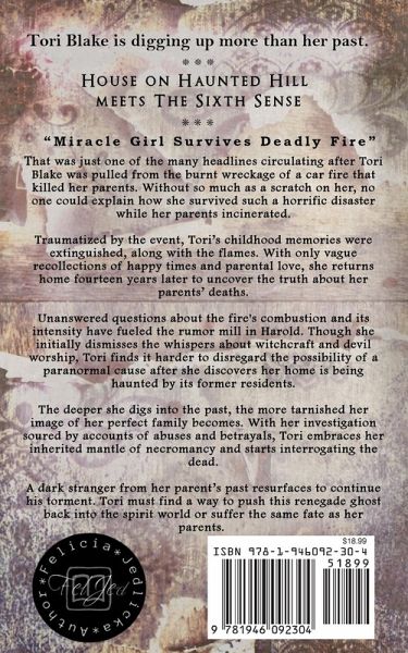 Tori Blake is digging up more than her past. House on Haunted Hill meets The Sixth Sense "Miracle Girl Survives Deadly Fire" That was just one of the many headlines circulating after Tori Blake was pulled from the burnt wreckage of a car fire that killed her parents. Without so much as a scratch on her, no one could explain how she survived such a horrific disaster while her parents were incinerated. Traumatized by the event, Tori's childhood memories were extinguished, along with the flames. With only vague recollections of happy times and parental love, she returns home fourteen years later to uncover the truth about her parents' deaths. Unanswered questions about the fire's combustion and its intensity have fueled the rumor mill in Harold. Though she initially dismisses the whispers about witchcraft and devil worship, Tori finds it harder to disregard the possibility of a paranormal cause after she discovers her home is being haunted by its former residents. The deeper she digs into the past, the more tarnished her image of her perfect family becomes. With her investigation soured by accounts of abuses and betrayals, Tori embraces her inherited mantle of necromancy and starts interrogating the dead. A dark stranger from her parent's past resurfaces to continue his torment. Tori must find a way to push this renegade ghost back into the spirit world or suffer the same fate as her parents.