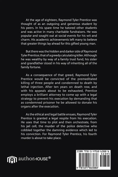 At the age of eighteen, Raymond Tyler Prentice was thought of as an outgoing and generous student by his peers. In his spare time he tutored other students and was active in many charitable fundraisers. He was popular and sought out at social events for his wit and charm. His academic achievements left many to believe that greater things lay ahead for this gifted young man. But there was the hidden and darker side of Raymond Tyler Prentice; that of a greedy calculating killer. Although he was wealthy by way of a family trust fund, his sister and grandfather stood in his way of inheriting all of the family fortune. As a consequence of that greed, Raymond Tyler Prentice would be convicted of the premeditated killing of three people and condemned to death by lethal injection. After ten years on death row, and with his appeals about to be exhausted, Prentice employs a brilliant attorney to come up with a legal strategy to prevent his execution by demanding that as condemned prisoner he be allowed to donate his organs after the execution. As the ethical and legal battle ensues, Raymond Tyler Prentice is granted a legal respite from his execution. He uses that time to plot and then orchestrate, from his jail cell, the murder of the police detective who cobbled together the damning evidence which led to his conviction. For Raymond Tyler Prentice, his fourth murder is about to take place.