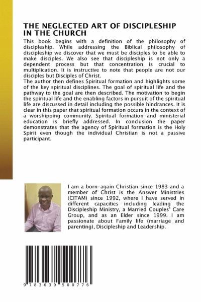 This book begins with a definition of the philosophy of discipleship. While addressing the Biblical philosophy of discipleship we discover that we must be disciples to be able to make disciples. We also see that discipleship is not only a dependent process but that concentration is crucial to multiplication. It is instructive to note that people are not our disciples but Disciples of Christ.The author then defines Spiritual formation and highlights some of the key spiritual disciplines. The goal of spiritual life and the pathway to the goal are then described. The motivation to begin the spiritual life and the enabling factors in pursuit of the spiritual life are discussed in detail including the possible hindrances. It is clear in this paper that spiritual formation occurs in the context of a worshipping community. Spiritual formation and ministerial education is briefly addressed. In conclusion the paper demonstrates that the agency of Spiritual formation is the Holy Spirit even though the individual Christian is not a passive participant.