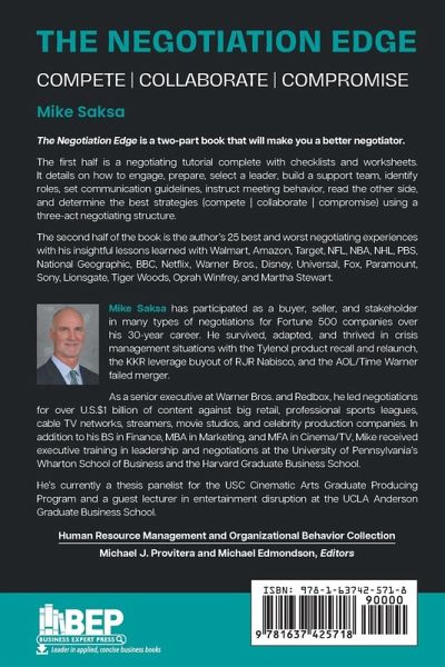 The Negotiation Edge is a two-part book that will make you a better negotiator. The first half is a negotiating tutorial complete with checklists and worksheets. It details on how-to engage, prepare, select a leader, build a support team, identify roles, set communication guidelines, instruct meeting behavior, read the other side, and determine the best strategies (compete collaborate compromise) using a three-act negotiating structure. The second half of the book is the author's twenty-five best and worst negotiating experiences with his insightful lessons learned with Walmart, Amazon, Target, NFL, NBA, NHL, PBS, National Geographic, BBC, Netflix, Warner Bros., Disney, Universal, Fox, Paramount, Sony, Lionsgate, Tiger Woods, Oprah Winfrey, and Martha Stewart.