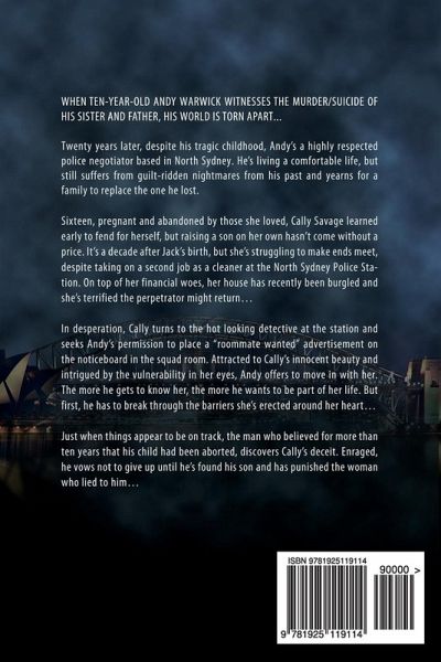 When ten-year-old Andy Warwick witnesses the murder/suicide of his sister and father, his world is torn apart. Twenty years later, despite his tragic childhood, Andy's a highly respected police negotiator based in North Sydney. He's living a comfortable life, but still suffers from guilt-ridden nightmares from his past and yearns for a family to replace the one he lost. Sixteen, pregnant and abandoned by those she loved, Cally Savage learned early to fend for herself, but raising a son on her own hasn't come without a price. It's a decade after Jack's birth, but she's struggling to make ends meet, despite taking on a second job as a cleaner at the North Sydney Police Station. On top of her financial woes, her house has recently been burgled and she's terrified the perpetrator might return... In desperation Cally turns to the hot looking detective at the station and seeks Andy's permission to place a "roommate wanted" advertisement on the noticeboard in the squad room. Attracted to Cally's innocent beauty and intrigued by the vulnerability in her eyes, Andy offers to move in with her. The more he gets to know her, the more he wants to be part of her life. But first, he has to break through the barriers she's erected around her heart... Just when things appear to be on track, the man who believed for more than ten years that his child had been aborted, discovers Cally's deceit. Enraged, he vows not to give up until he's found his son and punished the woman who lied to him...