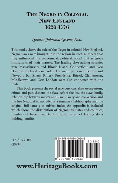 This books shows the role of the Negro in colonial New England. Negro slaves were brought into the region in such numbers that they influenced the economical, political, social and religious institutions of their masters. The leading slave-trading colonies were Massachusetts and Rhode Island; Connecticut and New Hampshire played lesser roles. The main ports were Boston and Newport, but Salem, Kittery, Providence, Bristol, Charlestown, Middletown and New London were also connected with the trade. This book presents the social repercussions, slave occupations, crimes and punishment, the slave before the law, the slave family, relationship between master and slave, slavery and conversion and the free Negro. Also included is a summary, bibliography and the original full-name plus subject index. An appendix is included which shows the distribution of Negroes by states and counties, numbers of burials and baptisms, and a list of leading slave-holding families.