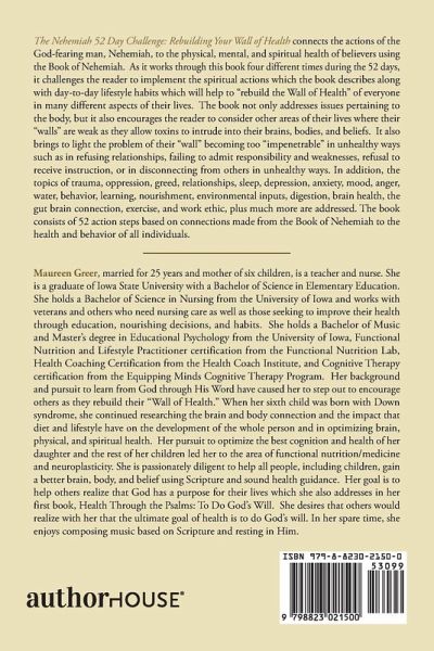 The Nehemiah 52 Day Challenge: Rebuilding Your Wall of Health connects the actions of the God-fearing man, Nehemiah, to the physical, mental, and spiritual health of believers using the Book of Nehemiah. As it works through this book four different times during the 52 days, it challenges the reader to implement the spiritual actions which the book describes along with day-to-day lifestyle habits which will help to "rebuild the Wall of Health" of everyone in many different aspects of their lives. The book not only addresses issues pertaining to the body, but it also encourages the reader to consider other areas of their lives where their "walls" are weak as they allow toxins to intrude into their brains, bodies, and beliefs. It also brings to light the problem of their "wall" becoming too "impenetrable" in unhealthy ways such as in refusing relationships, failing to admit responsibility and weaknesses, refusal to receive instruction, or in disconnecting from others in unhealthy ways. In addition, the topics of trauma, oppression, greed, relationships, sleep, depression, anxiety, mood, anger, water, behavior, learning, nourishment, environmental inputs, digestion, brain health, the gut brain connection, exercise, and work ethic, plus much more are addressed. The book consists of 52 action steps based on connections made from the Book of Nehemiah to the health and behavior of all individuals.