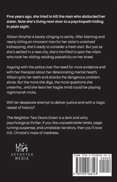 Five years ago, she tried to kill the man who abducted her sister. Now she's living next door to a psychopath hiding in plain sight. Allison Smythe is barely clinging to sanity. After blaming and nearly killing an innocent man for her sister's unsolved kidnapping, she's ready to consider a fresh start. But just as she's settled in a new city, she's horrified to spot the villain who took her sibling residing peacefully on her street. Arguing with the police over the need for more evidence and with her therapist about her deteriorating mental health, Allison grits her teeth and attacks the dangerous problem alone. But the more she digs, the more questions she unearths... and she fears her fragile mind could be playing nightmarish tricks. Will her desperate attempt to deliver justice end with a tragic repeat of history? The Neighbor Two Doors Down is a dark and witty psychological thriller. If you like unpredictable twists, page-turning suspense, and unreliable narrators, then you'll love H.K. Christie's maze of madness.