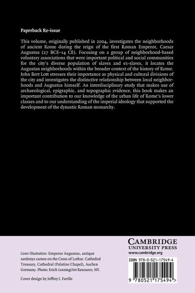 This volume, originally published in 2004, investigates the neighborhoods of ancient Rome during the reign of the first Roman Emperor, Caesar Augustus (27 BCE-14 CE). Focusing on a group of neighborhood-based voluntary associations that were important political and social communities for the city's diverse population of slaves and ex-slaves, it locates the Augustan neighborhoods within the broader context of the history of Rome. John Bert Lott stresses their importance as physical and cultural divisions of the city and investigates the distinctive relationship between local neighborhoods and Augustus himself. An interdisciplinary study that makes use of archaeological, epigraphic, and topographic evidence, this book makes an important contribution to our knowledge of the urban life of Rome's lower classes and to our understanding of the imperial ideology that supported the development of the dynastic Roman monarchy.