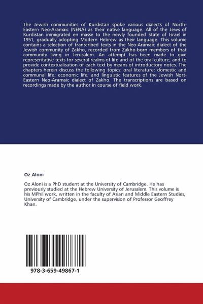 The Jewish communities of Kurdistan spoke various dialects of North-Eastern Neo-Aramaic (NENA) as their native language. All of the Jews of Kurdistan immigrated en masse to the newly founded State of Israel in 1951, gradually adopting Modern Hebrew as their language. This volume contains a selection of transcribed texts in the Neo-Aramaic dialect of the Jewish community of Zakho, recorded from Zakho-born members of that community living in Jerusalem. An attempt has been made to give representative texts for several realms of life and of the oral culture, and to provide contextualisation of each text by means of introductory notes. The chapters herein discuss the following topics: oral literature; domestic and communal life; economic life; and linguistic features of the Jewish Nort-Eastern Neo-Aramaic dialect of Zakho. The transcriptions are based on recordings made by the author in course of field work.
