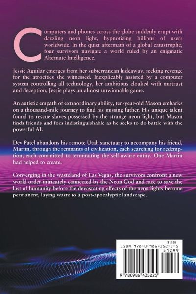 The Neon God Computers and phones across the globe suddenly erupt with dazzling neon light, hypnotizing billions of users worldwide. In the quiet aftermath of a global catastrophe four survivors navigate a world ruled by an enigmatic Alternate Intelligence. Jessie Aguilar emerges from her subterranean hideaway, seeking revenge for the atrocities she witnessed. Inexplicably assisted by a computer system controlling all technology, her ambitions cloaked with mistrust and deception, Jessie plays an almost unwinnable game. An autistic empath of extraordinary ability, ten-year-old Mason embarks on a thousand-mile journey to find his missing father. His unique talent is used to rescue slaves possessed by the strange neon light, but Mason finds friends and foes indistinguishable as he seeks to do battle with the powerful AI. Dev Patel abandons his remote Utah sanctuary to accompany his friend, Martin, through the remnants of civilization, each searching for redemption, each committed to terminating the self-aware entity. One Martin had helped to create. Converging in the wasteland of Las Vegas, the survivors confront a new world order intricately connected by the Neon God and race to save the last of humanity before the devastating effects of the neon lights become permanent, laying waste to a post-apocalyptic landscape.