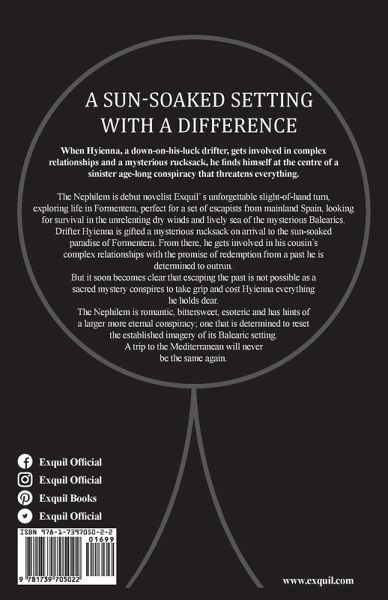 A sun-soaked setting with a difference When Hyienna, a down-on-his-luck drifter, gets involved in complex relationships and a mysterious rucksack, he finds himself at the centre of a sinister age-long conspiracy that threatens everything. The Nephilem is debut novelist Exquil' s unforgettable slight-of-hand turn, exploring life in Formentera, perfect for a set of escapists from mainland Spain, looking for survival in the unrelenting dry winds and lively sea of the mysterious Balearics. Drifter Hyienna is gifted a mysterious rucksack on arrival to the sun-soaked paradise of Formentera. From there, he gets involved in his cousin's complex relationships with the promise of redemption from a past he is determined to outrun. But it soon becomes clear that escaping the past is not possible as a sacred mystery conspires to take grip and cost Hyienna everything he holds dear. The Nephilem is romantic, bittersweet, esoteric and has hints of a larger more eternal conspiracy; one that is determined to reset the established imagery of its Balearic setting. A trip to the Mediterranean will never be the same again.