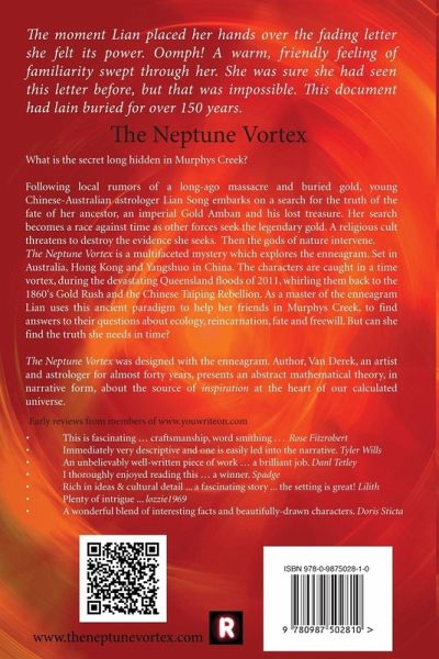 A mystery long hidden along Cemetery Road. An occult thriller! Following local rumours of a long-ago massacre and buried gold, young Chinese-Australian astrologer, Lian Song embarks on a search for the truth of the fate of her ancestor, an imperial Gold Amban and his lost treasure. A multifaceted, occult mystery set in Australia, Hong Kong and Yangshuo-China. In which the characters are caught in a time vortex, during recent devastating floods in Queensland, the 1860s Gold Rush and the Chinese Taiping Rebellion. With the help of her friends in Murphys Creek, Master of the Enneagram, Lian uses this ancient paradigm and astrology to search for the lost gold. The plot of The Neptune Vortex was designed with the enneagram, it's characters with the aid of astrology. In his companion-ontology, the author presents, deconstructs the novel and in narrative form, an abstract mathematical theory about the source of inspiration at the heart of our calculated universe.