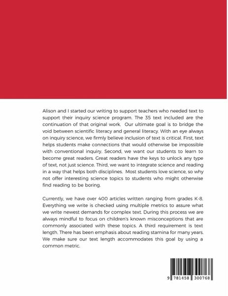 The text includes 25 articles associated with the common topics taught in a fifth grade grade science classroom. The goal of this text is to bridge the void between scientific literacy and general literacy. With an eye always on inquiry science, we firmly believe inclusion of text is critical. First, text helps students make connections that would otherwise be impossible with conventional inquiry. Second, we want students to learn to become great readers. Great readers have the keys to unlock any type of text, not just science. Third, we want to integrate science and reading in a way that helps both disciplines. Most students love science, so why not offer interesting science topics to students who might otherwise find reading to be boring. Everything included in this book is checked using multiple metrics to assure what we write to the newest demands for grade level complex text. During this process we¿are always mindful to focus on¿known misconceptions that are commonly associated¿with these topics.¿A third requirement is text length. There has been emphasis about reading stamina for many years. We make sure our text length accommodates this goal by using a common metric. Each article includes reading comprehension questions. Answers to these questions as well as many other associated resources can be found at our website: https://www.candlelightscience.com
