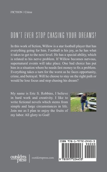 In this work of fiction, Willow is a star football player that has everything going for him. Football is his joy, as he has what it takes to get to the next level. He has a special ability, which is related to his nerve problem. If Willow becomes nervous, supernatural events will take place. One bad choice has put him in a situation where he needs fast money to fix a problem. Everything takes a turn for the worst as he faces opportunity, crime, and betrayal. Will he choose to stay on the right path or would he lose focus and stop chasing his dream?