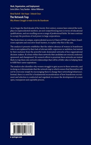 The analysis it presents establishes that the relative absence of women in boardroom roles is not explained by their lack of relevant skills, experience or ambition, but instead by their exclusion from the powerful male-dominated networks of key organisational decision-makers. It is from within these networks that candidates are sourced, endorsed, sponsored, and championed. Yet women's efforts to penetrate these networks are instead likely to trap them into network relationships that will beof little value in helping them to fulfil their career aspirations.
