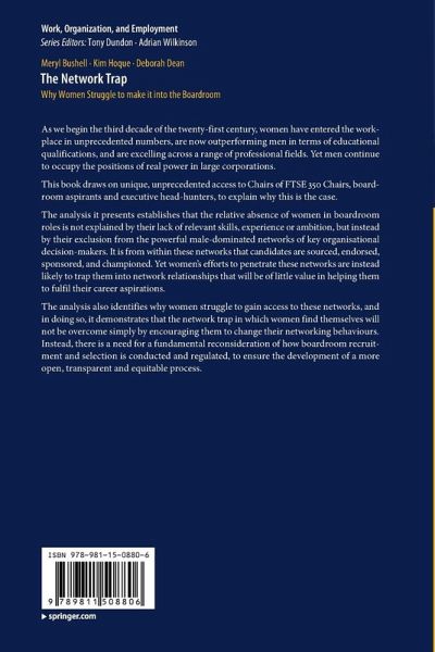 The analysis it presents establishes that the relative absence of women in boardroom roles is not explained by their lack of relevant skills, experience or ambition, but instead by their exclusion from the powerful male-dominated networks of key organisational decision-makers. It is from within these networks that candidates are sourced, endorsed, sponsored, and championed. Yet women's efforts to penetrate these networks are instead likely to trap them into network relationships that will beof little value in helping them to fulfil their career aspirations.