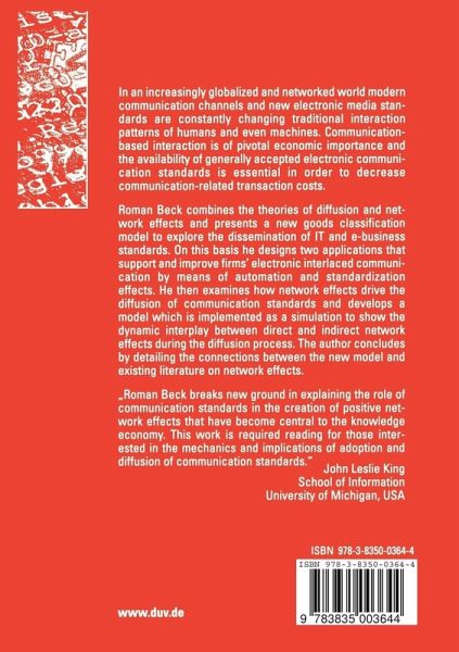 Roman Beck presents a new goods classification model to explore the dissemination of IT and e-business standards and designs two applications that support and improve firms' electronic interlaced communication by means of automation and standardization effects. He then examines how network effects drive the diffusion of communication standards and develops a model which is implemented as a simulation to show the dynamic interplay between direct and indirect network effects during the diffusion process. It also addresses critical mass and life cycle issues, as well as related utility changes in communication standards.
