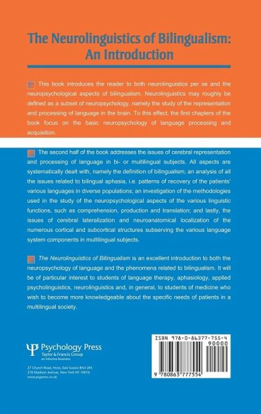 The text provides an introduction to both the neuropsychology of language and the phenomena related to bilingualism, and should be of particular interest to students of language therapy, aphasiology, applied psycholinguistics, neurolinguistics and, in general, to students of medicine who wish to become more knowledgeable about the specific needs of patients in a multilingual society.Introduces the reader to both neurolinguistics and the neuropsychological aspects of bilingualism. The text focuses on the neuropsychology of language processing and acquisition, and then addresses the issues of cerebral representation and