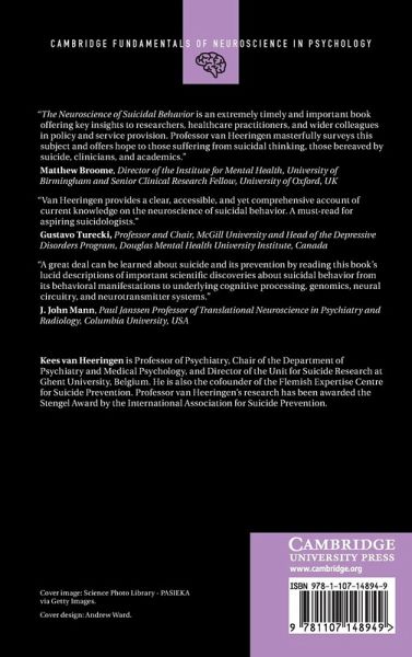 1. What is suicidal behavior, and can it be prevented?; 2. Stress, vulnerability, and suicide: the stress-diathesis model; 3. The dark side of the brain: neuroscience approaches to suicidal behavior; 4. Lethal signals: the molecular neuroscience of suicidal behavior; 5. I think, therefore I do not want to be: the cognitive neuroscience of suicidal behavior; 6. Images of the suicidal brain: systems neuroscience and suicide; 7. In my end is my beginning: a developmental neuroscience perspective of suicidal behavior; 8. I predict, therefore I cannot be: a predictive coding account of suicidal behavior; 9. Predicting the unpredictable: the contribution of neuroscience to suicide prediction; 10. The treatment of suicide risk: neuroscience aspects.