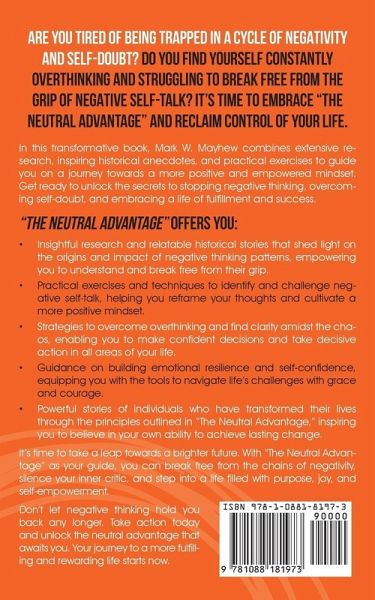 Are you tired of being trapped in a cycle of negativity and self-doubt? Do you find yourself constantly overthinking and struggling to break free from the grip of negative self-talk? It's time to embrace "The Neutral Advantage" and reclaim control of your life. In this transformative self-help book, Mark W. Mayhew combines extensive research, inspiring historical anecdotes, and practical exercises to guide you on a journey towards a more positive and empowered mindset. Get ready to unlock the secrets to stopping negative thinking, overcoming self-doubt, and embracing a life of fulfillment and success. "The Neutral Advantage" offers you:Insightful research and relatable historical stories that shed light on the origins and impact of negative thinking patterns, empowering you to understand and break free from their grip. Practical exercises and techniques to identify and challenge negative self-talk, helping you reframe your thoughts and cultivate a more positive mindset. Strategies to overcome overthinking and find clarity amidst the chaos, enabling you to make confident decisions and take decisive action in all areas of your life. Guidance on building emotional resilience and self-confidence, equipping you with the tools to navigate life's challenges with grace and courage. Powerful stories of individuals who have transformed their lives through the principles outlined in "The Neutral Advantage," inspiring you to believe in your own ability to achieve lasting change. It's time to take a leap towards a brighter future. With "The Neutral Advantage" as your guide, you can break free from the chains of negativity, silence your inner critic, and step into a life filled with purpose, joy, and self-empowerment. Don't let negative thinking hold you back any longer. Take action today and unlock the neutral advantage that awaits you. Your journey to a more fulfilling and rewarding life starts now. .