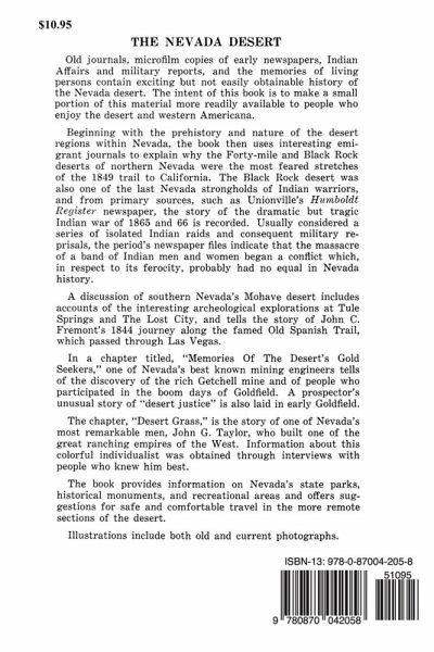 Old journals, microfilm copies of early newspapers, Indian Affairs and military reports, and the memories of living persons are compiled to form an excellent survey of the history of the people, animals and geography of the Nevada desert.