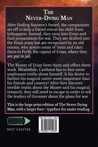 After finding Sauvern's Sword, the companions set off to help a friend rescue his child from kidnappers. Instead, they stray into Erian and find preparations for war. They are drafted into the Erian army but are recognized by an old enemy, who arrests some of them and takes them to Frelli, the capital of Erian, where they are put in jail. The Master of Erian frees them and offers them work. Meanwhile, Carthinal has to face some unpleasant truths about himself. Is his desire to further his magical career more important than his friends and country? After they discover terrible truths about the Master and his magical research, they will need to escape in order to tell the leaders of Grosmer about the plans for war. This is the large print edition of The Never-Dying Man, with a larger font / typeface for easier reading.