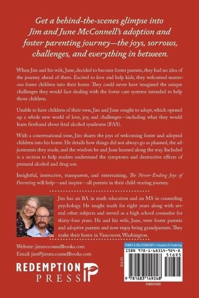 Get a behind-the-scenes glimpse into Jim and June McConnell's adoption and foster parenting journey-the joys, sorrows, challenges, and everything in between. When Jim and his wife, June, decided to become foster parents, they had no idea of the journey ahead of them. Excited to love and help kids, they welcomed numerous foster children into their home. They could never have imagined the unique challenges they would face dealing with the foster care systems intended to help those children. Unable to have children of their own, Jim and June sought to adopt, which opened up a whole new world of love, joy, and challenges-including what they would learn firsthand about fetal alcohol syndrome (FAS). With a conversational tone, Jim shares the joys of welcoming foster and adopted children into his home. He details how things did not always go as planned, the adjustments they made, and the wisdom he and June learned along the way. Included is a section to help readers understand the symptoms and destructive effects of prenatal alcohol and drug use. Insightful, instructive, transparent, and entertaining, The Never-Ending Joys of Parenting will help-and inspire-all parents in their child-rearing journey.