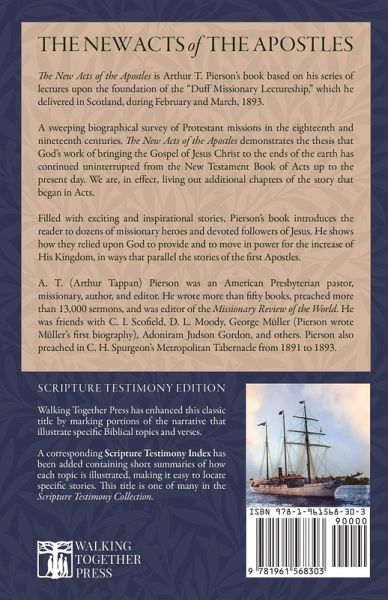The New Acts of the Apostles is Arthur T. Pierson's book based on his series of lectures upon the foundation of the "Duff Missionary Lectureship," which he delivered in Scotland, during February and March, 1893. A sweeping biographical survey of Protestant missions in the eighteenth and nineteenth centuries, The New Acts of the Apostles demonstrates the thesis that God's work of bringing the Gospel of Jesus Christ to the ends of the earth has continued uninterrupted from the New Testament Book of Acts up to the present day. We are, in effect, living out additional chapters of the story that began in Acts. Filled with exciting and inspirational stories, Pierson's book introduces the reader to dozens of missionary heroes and devoted followers of Jesus. He shows how they relied upon God to provide and to move in power for the increase of His Kingdom, in ways that parallel the stories of the first Apostles. A. T. (Arthur Tappan) Pierson was an American Presbyterian pastor, missionary, author, and editor. He wrote more than fifty books, preached more than 13,000 sermons, and was editor of the Missionary Review of the World. He was friends with C. I. Scofield, D. L. Moody, George Müller (Pierson wrote Müller's first biography), Adoniram Judson Gordon, and others. Pierson also preached in C. H. Spurgeon's Metropolitan Tabernacle from 1891 to 1893. About the Scripture Testimony Edition Walking Together Press has enhanced this classic title by identifying and marking portions of the narrative that illustrate specific Biblical topics and verses. A corresponding Scripture Testimony Index has been added containing short summaries of how each topic is illustrated, making it easy to locate specific stories. This title is one of many in the Scripture Testimony Collection.
