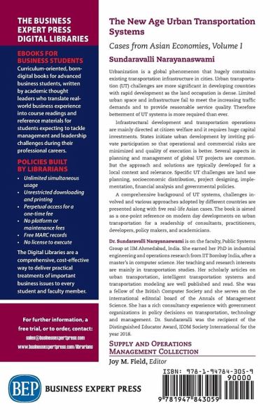 Urbanization is a global phenomenon that hugely constrains existing transportation infrastructure in cities. Urban transportation (UT) challenges are more significant in developing countries with rapid development as the land occupation is dense.Limited urban space and infrastructure fail to meet the increasing traffic demands and to provide reasonable service quality. Therefore betterment of UT systems is more required than ever. Infrastructural development and transportation operations are mainly directed at citizen welfare and it requires huge capital investments. States initiate urban development by inviting private participation so that operational and commercial risks are minimized and quality of execution is better. Several aspects in planning and management of global UT projects are common. But the approach and solutions are typically developed for a local context and relevance. Specific UT challenges are land use planning, socioeconomic distribution, project designing, implementation, financial analysis and governmental policies. A comprehensive background of UT systems, challenges involved and various approaches adopted by different countries are presented along with five real-life Asian cases. The book is aimed as a one-point reference on modern day developments on urban transportation for a readership of consultants, practitioners, developers, policy makers, and academicians.