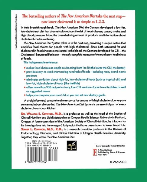 In their breakthrough book, The New American Diet, the Connors developed a low-fat, low-cholesterol diet that dramatically reduces the risk of heart disease, cancer, stroke, and high blood pressure. Now, the overwhelming amount of products and information about cholesterol can be confusing. The New American Diet System takes us to the next step, providing a unique system that simplifies food choices for people with high cholesterol. Since both saturated fat and cholesterol in foods increase cholesterol in the blood, the Connors developed the CSI -- the Cholesterol-Saturated Fat Index -- the only complete measure of the true heart-healthiness of foods. This indispensable reference: -- makes food choices as simple as choosing from 1 to 10 (the lower the CSI, the better) -- provides easy-to-read charts rating hundreds of foods -- including many brand-name products -- eliminates confusion about high-fat, low-cholesterol foods (such as tropical oils) and low-fat, high-cholesterol foods (like shellfish) -- offers more than 300 recipes for tasty, low-CSI versions of your favorite dishes as well as suggested menus -- helps you compute your own CSI so you can set new dietary goals. A straightforward, comprehensive resource for anyone with high cholesterol, or anyone concerned about dietary fat, The New American Diet System is an essential part of every cholesterol-conscious kitchen.