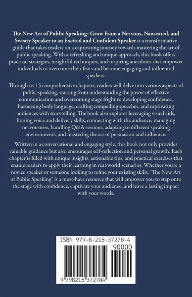 The New Art of Public Speaking: Grow From a Nervous, Nauseated, and Sweaty Speaker to an Excited and Confident Speaker is a transformative guide that takes readers on a captivating journey towards mastering the art of public speaking. With a refreshing and unique approach, this book offers practical strategies, insightful techniques, and inspiring anecdotes that empower individuals to overcome their fears and become engaging and influential speakers. Through its 15 comprehensive chapters, readers will delve into various aspects of public speaking, starting from understanding the power of effective communication and overcoming stage fright to developing confidence, harnessing body language, crafting compelling speeches, and captivating audiences with storytelling. The book also explores leveraging visual aids, honing voice and delivery skills, connecting with the audience, managing nervousness, handling Q&A sessions, adapting to different speaking environments, and mastering the art of persuasion and influence. Written in a conversational and engaging style, this book not only provides valuable guidance but also encourages self-reflection and personal growth. Each chapter is filled with unique insights, actionable tips, and practical exercises that enable readers to apply their learning in real-world scenarios. Whether you're a novice speaker or someone looking to refine your existing skills, "The New Art of Public Speaking" is a must-have resource that will empower you to step onto the stage with confidence, captivate your audience, and leave a lasting impact with your words.