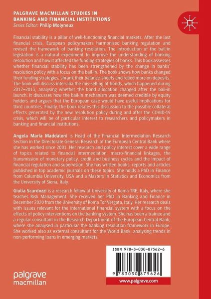 Financial stability is a pillar of well-functioning financial markets. After the last financial crisis, European policymakers harmonised banking regulation and revised the framework of banking resolution. The introduction of the bail-in legislation is a natural experiment to improve the understanding of banking resolution and how it affected the funding strategies of banks. This book assesses whether financial stability has been strengthened by the change in banks' resolution policy with a focus on the bail-in. The book shows how banks changed their funding strategies, shrank their balance-sheets and relied more on deposits. The book will discuss inter-alia the mis-selling of bonds, which happened during 2012-2013, analysing whether the bond allocation changed after the bail-in launch. It discusses how the bail-in mechanism was deemed credible by equity holders and argues that the European case would have useful implications for third countries. Finally, the book relates this discussion to the possible collateral effects generated by the new resolution policy during and after the COVID-19 crisis, which will be of particular interest to researchers and policymakers in banking and financial institutions.