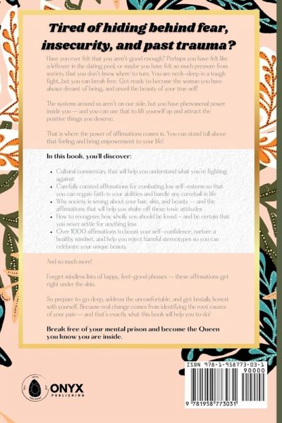 Tired of hiding behind fear, insecurity, and past trauma? Get ready to become the woman you've always dreamt of being, and unveil the beauty of your true self... Society is hellbent on trying to force us, as Black women, to be different versions of ourselves... We're pulled in so many directions that it's easy to lose sense of our true identity. Have you ever felt that you're not good enough? Perhaps you've felt like a leftover in the dating pool... or maybe you've felt so much pressure from society that you don't know where to turn. No matter how hard you work, you feel like you'll never be picked for that promotion. And your fears are real - for every 100 men who land a managerial post, only 60 Black women have the same success... You're neck-deep in a tough fight... but there's a way you can break free. The systems around us aren't on our side, but you have phenomenal power inside you - and you can use that to lift yourself up and attract the positive things you deserve from life. For some of us, there's a grief that runs so deep we're not sure that we'll ever heal - and if that sounds like you, you might feel close to giving up sometimes. But that's where the power of affirmations comes in... You can stand tall above that feeling and bring recognition and empowerment to your life. This guide will show you how. Inside, you'll discover: * Cultural commentary that will help you understand what you're fighting against (including the struggles you may not even have been aware of) * The perfect time of day to use positive affirmations - and why it works * Carefully curated affirmations for combating low self-esteem... so that you can regain faith in your abilities and handle any curveball life throws your way * How you can recognize your true value at work - and make sure your bosses see it too * Essential affirmations to keep you fit, healthy, and in love with your banging body * Why society is wrong about your hair, skin, and beauty - and the affirmations that will help you shake off these toxic attitudes * Inspiring affirmations to help you jump any hurdle motherhood has in store for you (no matter how exhausted you are) * Why your money mindset is holding you back - and how you can shift your perspective * How to make sure you recognize just how wholly you should be loved - and be certain that you never settle for anything less * Everything you need to hear from yourself before you go to bed so that you rest well and wake up ready to fight for your goals * A clear understanding of why affirmations work and how to use them to great effect (according to science!) * Over 1000 affirmations to boost your self-confidence, nurture a healthy mindset, and help you reject harmful stereotypes so you can celebrate your unique beauty And much more. Even if you've spent your whole life struggling to see yourself as a queen, you can change how you view yourself today. Defeatist thoughts are your enemy: Countless Black women have escaped the mental prison society has forced them into - and you can do it too. Forget mindless lists of happy, feel-good phrases - these affirmations get right under the skin. So prepare to go deep, address the uncomfortable, and get brutally honest with yourself... Because real change comes from identifying the root causes of your pain - and that's exactly what this book will help you to do. Break free of your mental prison, and become the queen you know you are inside.