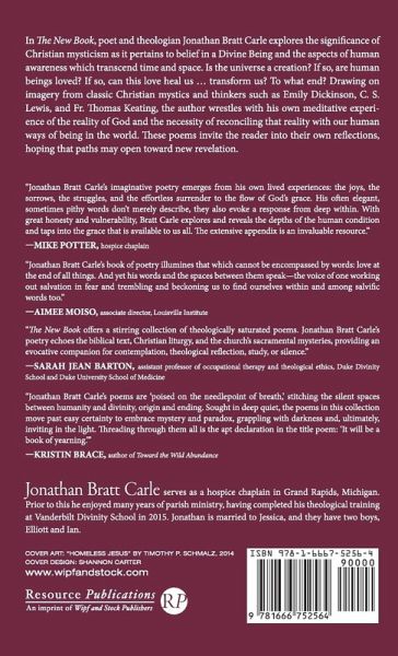 In The New Book, poet and theologian Jonathan Bratt Carle explores the significance of Christian mysticism as it pertains to belief in a Divine Being and the aspects of human awareness which transcend time and space. Is the universe a creation? If so, are human beings loved? If so, can this love heal us ... transform us? To what end? Drawing on imagery from classic Christian mystics and thinkers such as Emily Dickinson, C. S. Lewis, and Fr. Thomas Keating, the author wrestles with his own meditative experience of the reality of God and the necessity of reconciling that reality with our human ways of being in the world. These poems invite the reader into their own reflections, hoping that paths may open toward new revelation.