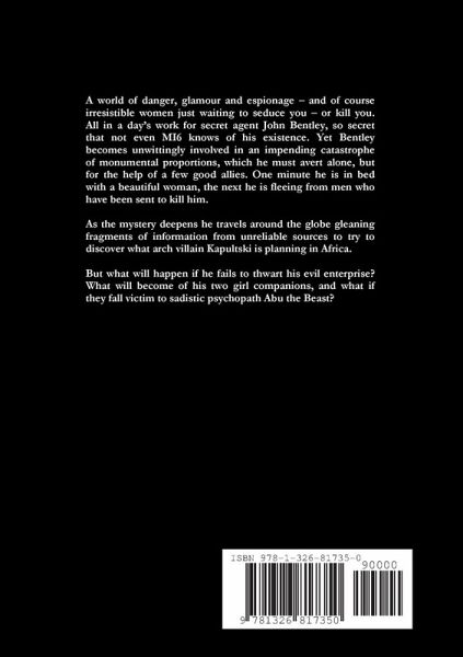 A world of danger, glamour and espionage - and of course irresistible women just waiting to seduce you - or kill you. All in a day's work for secret agent John Bentley, so secret that not even MI6 knows of his existence. Yet Bentley becomes unwittingly involved in an impending catastrophe of monumental proportions, which he must avert alone, but for the help of a few good allies. One minute he is in bed with a beautiful woman, the next he is fleeing from men who have been sent to kill him. As the mystery deepens he travels around the globe gleaning fragments of information from unreliable sources to try to discover what arch villain Kapultski is planning in Africa. But what will happen if he fails to thwart his evil enterprise? What will become of his two girl companions, and what if they fall victim to sadistic psychopath Abu the Beast?