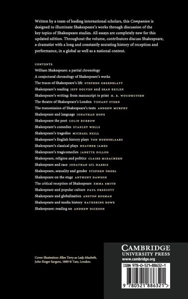 Preface William Shakespeare: a partial chronology Shakespeare's works: a conjectural chronology 1. The traces of Shakespeare's life STEPHEN GREENBLATT 2. Shakespeare's reading JEFF DOLVEN and SEAN KEILEN 3. Shakespeare's writing H. R. WOUDHUYSEN 4. The theatre of Shakespeare's London TIFFANY STERN 5. Transmission of Shakespeare's texts ANDREW MURPHY 6. Shakespeare and language JONATHAN HOPE 7. Shakespeare the poet COLIN BURROW 8. Shakespeare's comedies STANLEY WELLS 9. Shakespeare's tragedies MICHAEL NEILL 10. Shakespeare's English history plays TON HOENSELAARS 11. Shakespeare's Classical plays HEATHER JAMES 12. Shakespeare's tragicomedies JANETTE DILLON 13. Shakespeare, religion and politics CLAIRE MCEACHERN 14. Shakespeare and race JONATHAN GIL HARRIS 15. Shakespeare, sex and gender STEPHEN ORGEL 16. Shakespeare's stage ANTHONY DAWSON 17. The critical reception of Shakespeare EMMA SMITH 18. Shakespeare and popular culture PAUL PRESCOTT 19. Shakespeare and globalization ANSTON BOSMAN 20. Shakespeare and media history KATHERINE ROWE 21. Shakespeare: reading on ANDREW DICKSON.