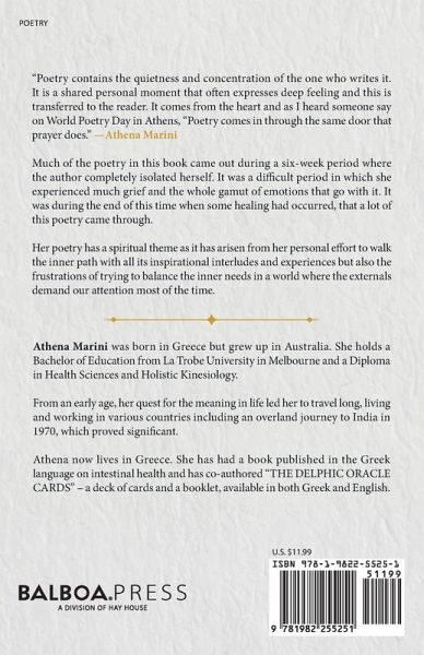"Poetry contains the quietness and concentration of the one who writes it. It is a shared personal moment that often expresses deep feeling and this is transferred to the reader. It comes from the heart and as I heard someone say on World Poetry Day in Athens, "Poetry comes in through the same door that prayer does." -Athena Marini Much of the poetry in this book came out during a six-week period where the author isolated myself for 6 weeks. It was a difficult period in which she experienced much grief and all the gamut of emotions that go with it. It was during the end of this time when some healing had occurred, that a lot of this poetry came out. Her poetry has a spiritual theme as it has arisen from her personal effort to walk the inner path with all its inspirational interludes and experiences but also the frustrations of trying to balance the inner needs in a world where the externals demand our attention most of the time.